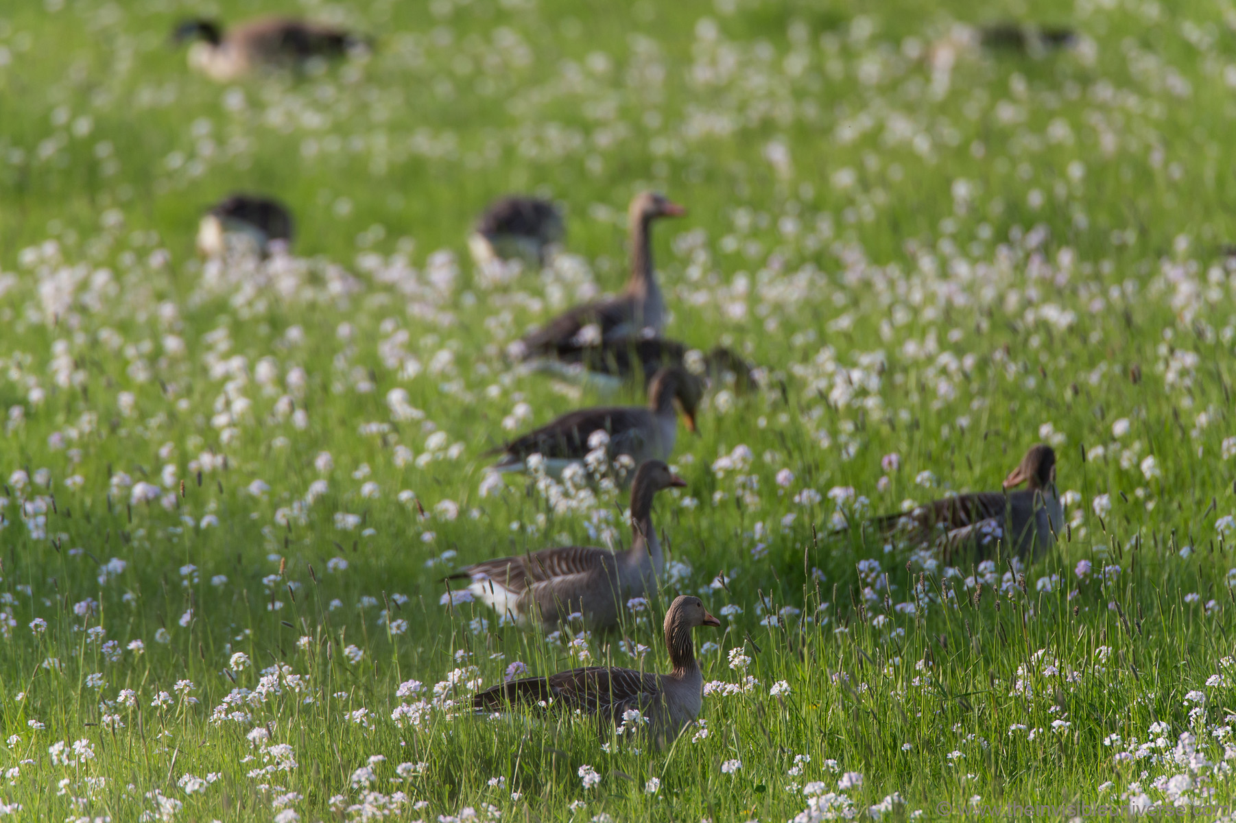Die Mersch hat auch viele andere Besucher und Bewohner. Neben Höckerschwänen und vielen Gänsen gibt es Bisamratten, Rohrammern, Fitis und Zilpzalp, Dorngrasmücke, ...