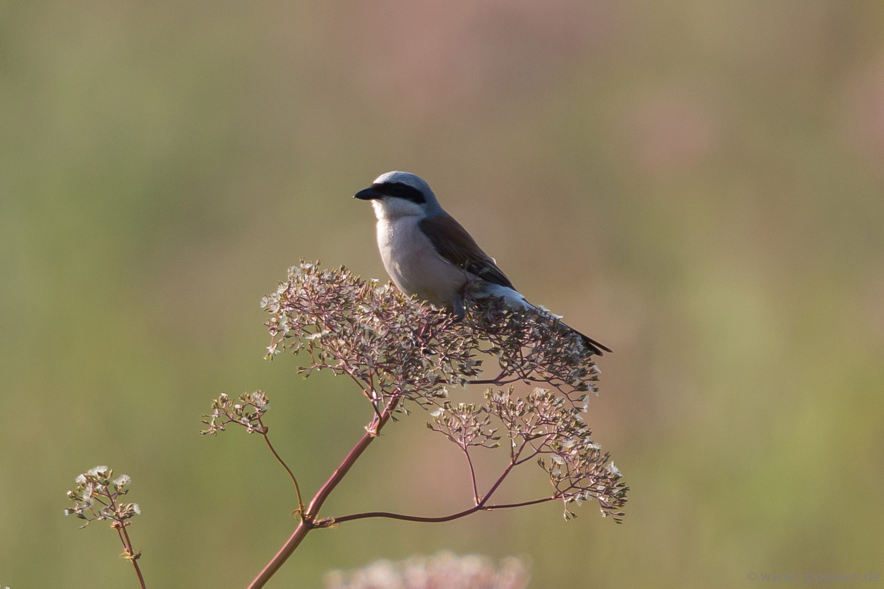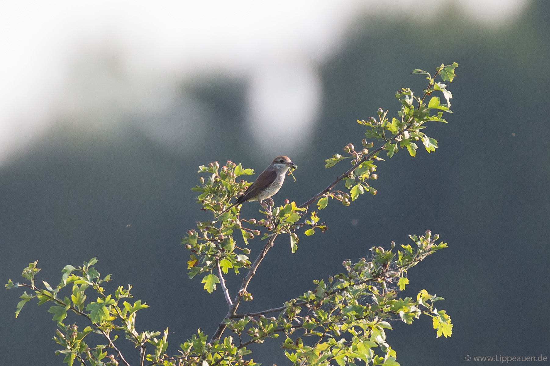 Etwas versteckt halten sich zwei Neuntöter auf, die Eisvögel der Lippewiesen. Wie die blau gefiederten Verwandten sitzen die Neuntöter exponiert auf einem Ast eines Busches oder abgestorbenen Baumes und halten mit Argusaugen Ausschau nach Insekten im Gras. Blitzschnell stürzen sie sich ins Gras und kommen mit einem Insekt wieder hervor um sich gleich wieder an den angestammten Aussichtsplatz zu begeben und das Insekt zu verspeisen. Im Hochsommer habe ich dann auch einen Neutöter Jungvogel beobachten können.