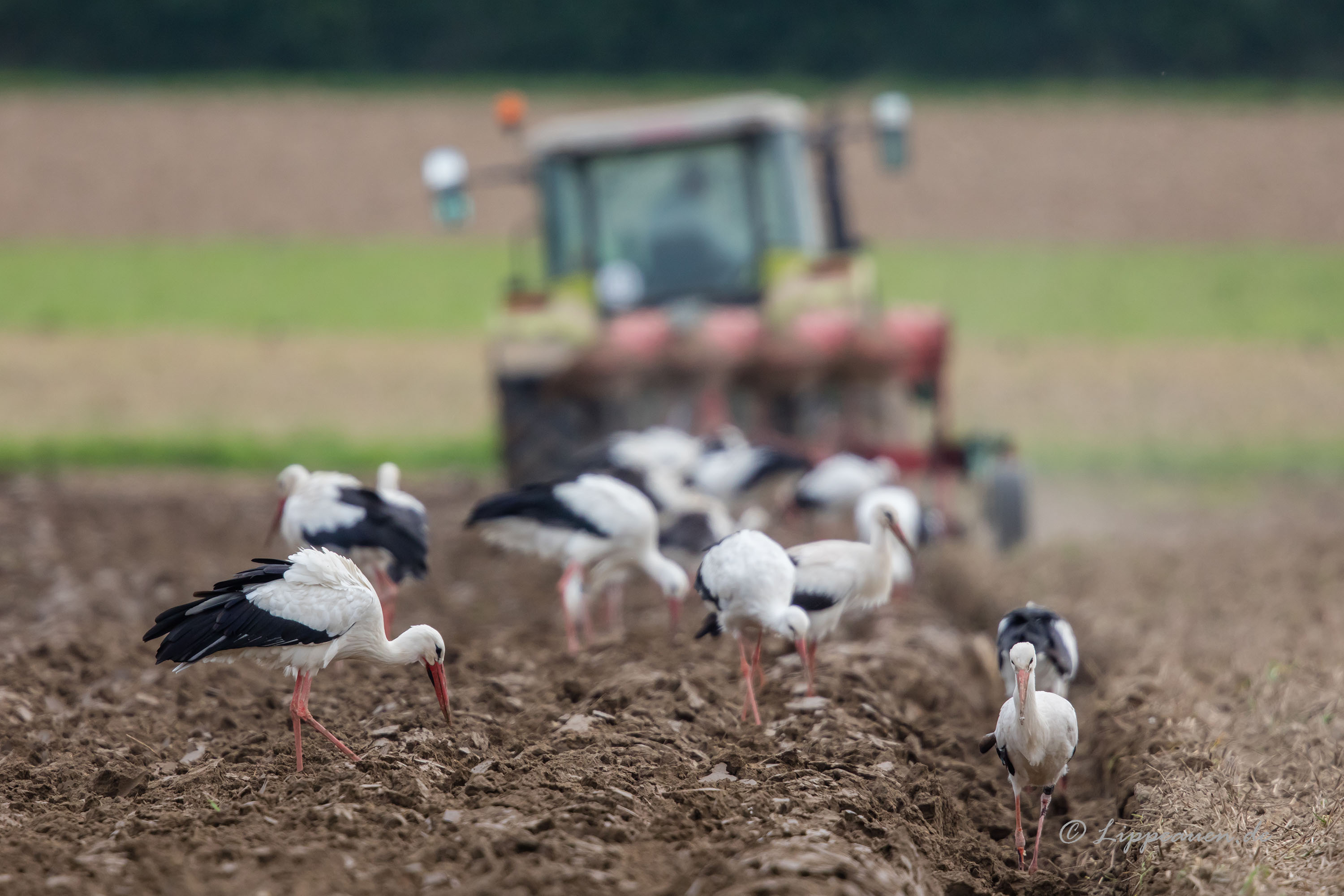 Im Spätsommer sammeln sich Jung- und Altstörche auf den Feldern rund um die Ahsewiesen für ihren Herbstzug nach Süden. Canon 5DsR + EF 100-400.