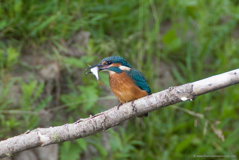 Unten: ein Eisvogel hat einen kleinen Fisch in dem Graben an der Beobachtungsplattform gefangen